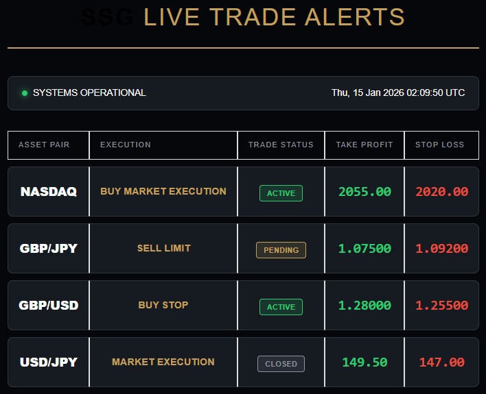 SSG Live Trade Alerts delivers live market setups with defined entry, stop loss, and target levels, built for disciplined traders who value clarity and speed.